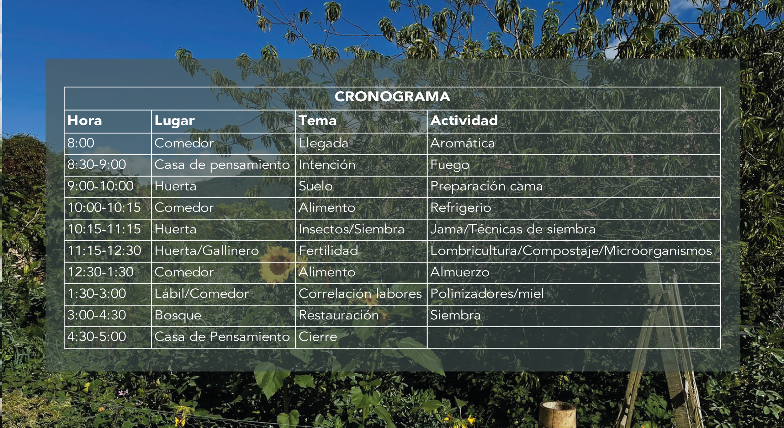 Estas son jornadas de inmersión, diálogo y experimentación en nuestro Centro de Regeneración (Tenjo, Cundinamarca), espacio en el que desde hace más de una década hemos labrado una trayectoria diseñando e implementando diversos sistemas agroforestales, siembra con preparados biodinámicos, diseño permacultural aplicado, lábil -refugio, aula, laboratorio para el intercambio de saberes sobre los polinizadores- y escenarios para el resguardo de las semillas nativas y de los saberes gastronómicos tradicionales.